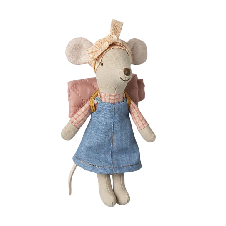 This mouse is well-prepared for a hiking trip in the wild. She is dressed for days of walking and brings her sleeping bag for nights under the stars. This style has magnets in her hands.
