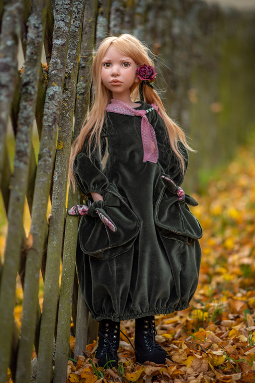 Ludowika has a beautiful hand painted face, human hair wig and German glass hand-blown eyes. She has a full vinyl body with 10 joints – so she is fully moveable. She wears real leather shoes, and a beautifully detailed high quality outfit.
